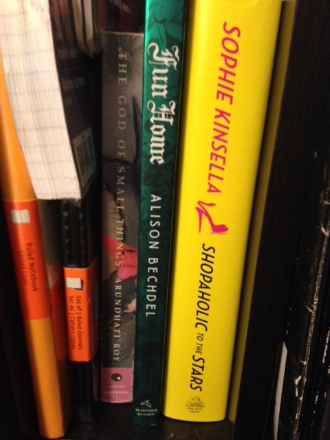 And even if I did have the money, the idea of curating my bookshelf terrifies me. There is so much pressure to select the right books, my favorite books, the books that say good things about me. Now, I just have books that I have borrowed (stolen), received, or purchased for $1 on a whim. My collection is organic and varied. Just now when I look over, I see: Shopaholic to the Stars (free, haven’t read) next to Fun Home (read and loved) next to The God of Small Things (stole, started, never finished). This weird play on my reading habits and lifestyle occurs all over the bookshelf and their arrangement tells a story unintentionally. For example, The Elements of Style is snuggled against Fear and Loathing: On the Campaign Trail ’72. Funny things like that.