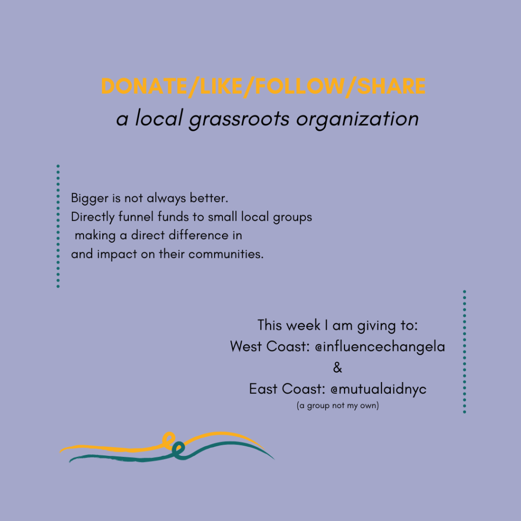 Weekly on my Instagram page I share organizations to get involved with, places to donate, petitions to sign, and tools for education on various social issues. Mostly these revolve around racial justice and my NYC community– but there’s a lot more I share! The below is where you can find my most recent posts and a round-up of past posts that are still active. Just click the image to visit each.
